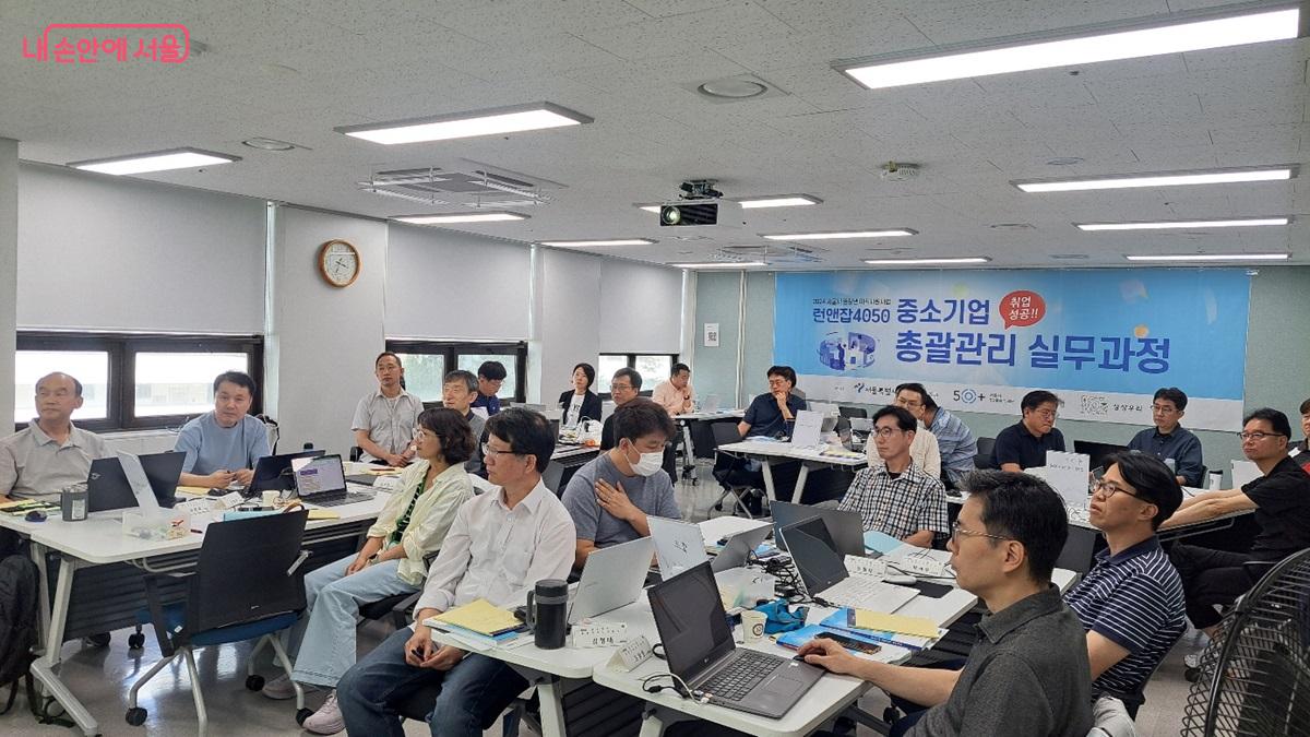 지난 5월 28일, 서울시50플러스 중부캠퍼스 4층 교육실에서 운영되고 있는 ‘런앤잡4050: 중소기업 총괄관리 실무 과정’ 현장은 집중하고 있는 교육생들의 열정으로 가득했다. 실무에 활용되는 다양한 양식의 문서를 작업하느라 모두 노트북 앞에서 분주한 모습이었다.