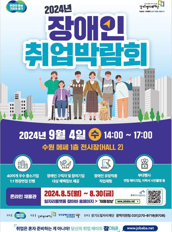 구직을 원하는 장애인은 장애인등록증, 이력서, 자격증(소지자) 등을 소지하고 행사장을 방문하면 됩니다. 보다 자세한 사항은 경기도일자리재단으로 문의하면 됩니다.
