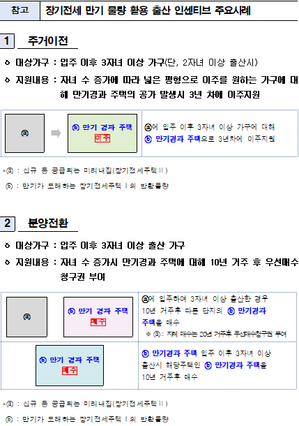 □ 임대 기한이 만료되는 물량이 ‘미리 내 집’ 출산 인센티브로 활용됨에 따라 현재 장기전세주택 거주자는 추가계약 연장이나 분양전환 등 지원은 제공되지 않는다.