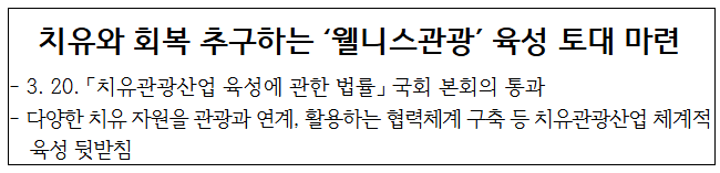 정부는 그간 국정과제로 ‘여행으로 행복한 국민, 관광으로 발전하는 대한민국(61번)*’을 선정, 국민의 여행 기회 확대와 관광을 통한 지역 경제 활성화 등을 위해 노력하고, 관련 법 제정에도 힘써왔다. 특히, 이번 「치유관광산업법」은 국민의힘 배현진 의원과 더불어민주당 김윤덕 의원이 발의한 관련 법안이 통합·제정된 법으로서 치유관광산업 육성을 위해 정부와 국회가 함께 노력한 결과물이라는 점에서 더욱 큰 의미가 있다.