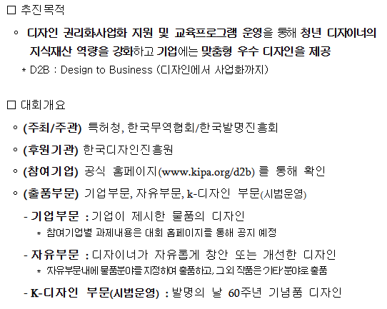 한편, 참가 신청 및 자세한 사항은 D2B 디자인 페어 누리집(www.kipa.org/d2b) 또는 D2B 사무국(d2b@kipa.org, 02-3459-2819)으로 문의하면 된다.
