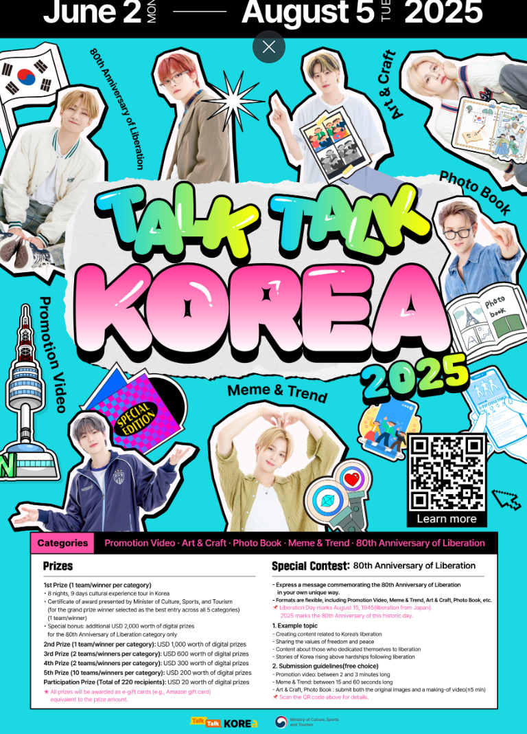 문화체육관광부(장관 유인촌, 이하 문체부)는 6월 2일(월)부터 8월 5일(화)까지 전 세계인을 대상으로 국제 콘텐츠 공모전 ‘토크토크코리아(Talk Talk Korea) 2025’를 개최한다.