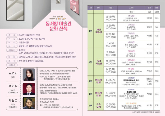 강연은 분당도서관 시청각실에서 진행하며, 회차별 초빙 강사가 △로마&피렌체 미술관(1회차) △파리 미술관(2회차) △런던 미술관(3회차) △뉴욕 미술관(4회차) △한국 미술관(5·6·7회차)을 주제로 강의한다.